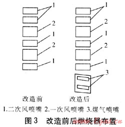 鍋爐原煤粉燃燒器為四角切圓布置,考慮到煤氣燃燒與煤粉燃燒的兼容性和爐內(nèi)空氣動力場的穩(wěn)定性,煤氣燃燒器仍以切圓布置方式為宜。經(jīng)計算,若煤氣燃燒器采用布置在原煤粉燃燒器下的四角切圓燃燒,則要求原煤粉燃燒器下層噴嘴至運行層的間距應(yīng)不小于1000mm,而實際間距僅有700mm,四角切圓方案難以實現(xiàn)。因此,煤氣燃燒系統(tǒng)最終采用六角切圓布置方式,其中4只煤氣噴嘴直接布置在煤粉噴嘴下部,另外2只煤氣噴嘴布置在左右側(cè)墻的中心,主煤氣輸送管道進(jìn)入鍋爐房后分為兩根煤氣分管道布置于鍋爐兩側(cè),每根分管道再各分出3根支管連接煤氣燃燒器,見圖2。為擴大切圓直徑,增加受熱面的吸熱量,降低火焰中心位置,煤氣燃燒器出口軸線分別在原煤粉燃燒器噴嘴出口軸線方向上水平向外偏轉(zhuǎn)20°,向下偏轉(zhuǎn)20°。改造前后燃燒器布置見圖3。綜合考慮低熱值煤氣著火與燃燒的穩(wěn)定性及火焰的長度,煤氣燃燒器采用雙通道煤氣噴嘴,具有部分預(yù)混作用,噴嘴出口煤氣流速約32m/s,空氣流速約35m/s[4~7]。