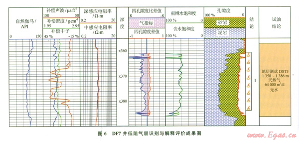 摘 要 鶯歌海盆地東方1-1氣田發(fā)現了眾多低阻氣層,其三孔隙度曲線“鏡像”不明顯,地層電阻率接近臨近水層和泥巖的值,難以有效識別。為此,從儲層巖性、孔隙結構以及地層水性質等方面對低阻氣層的成因機理進行了研究,在明確了低阻氣層成因的基礎上,提出了利用四孔隙度差值法、四孔隙度比值法對低阻氣層進行定性識別方法;依據導電效率模型對低阻氣層含水飽和度進行了計算,結合孔隙度與氣柱高度計算得到的束縛水飽和度,可以據此有效地對低阻氣層的產液性質進行判斷。實際應用結果表明,該方法在東方1-1氣田低阻氣層解釋評價中取得了良好的效果,與測試結果相吻合。