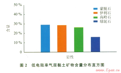 根據薄片鑒定分析和粒度分析資料,東方區(qū)塊低電阻率氣層巖性主要為由細-極細粒的石英粉砂和泥質組成的泥質粉砂巖。圖1為低阻氣層巖心粒度分析的黏土與粉砂含量分布直方圖,可見低阻氣層巖石顆粒成分主要為黏土與粉砂,二者之和約為80%。圖2為低阻氣層巖心X射線衍射分析得到的黏土礦物分布直方圖,由圖可見,低阻氣層的黏土礦物主要為蒙脫石與伊利石,兩者的含量總和達到60%。細顆粒巖性對儲層電阻率的影響主要體現在以下兩方面:①儲層中細顆粒成分越多,巖石的比表面積就會越大,顆粒表附大量的束縛水,增強巖石導電性;②小巖粒含量越高,地層中小孔隙和小喉道就越發(fā)育,使巖層中殘余水(束縛水)含量急劇升高,這又增強了巖石導電性,使地層電阻率下降。由此可見,巖性細是形成東方區(qū)塊部分氣層低電阻率特性的基本地質環(huán)境[3-5]。