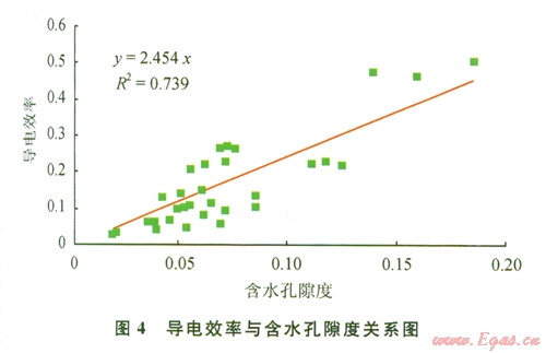 利用上式計算低阻氣層含水飽和度,關鍵是確定式中的以a't值,高楚橋利用巖心巖電實驗結果剖析了導電效率(E)與含水孔隙度(φw)之間的關系[6-7],二者之間具有良好的線性關系,由此可以利用研究區(qū)地層溫壓條件下的巖電實驗結果求得式(7)中的a't值,見圖4。由此可知a't=2.454.