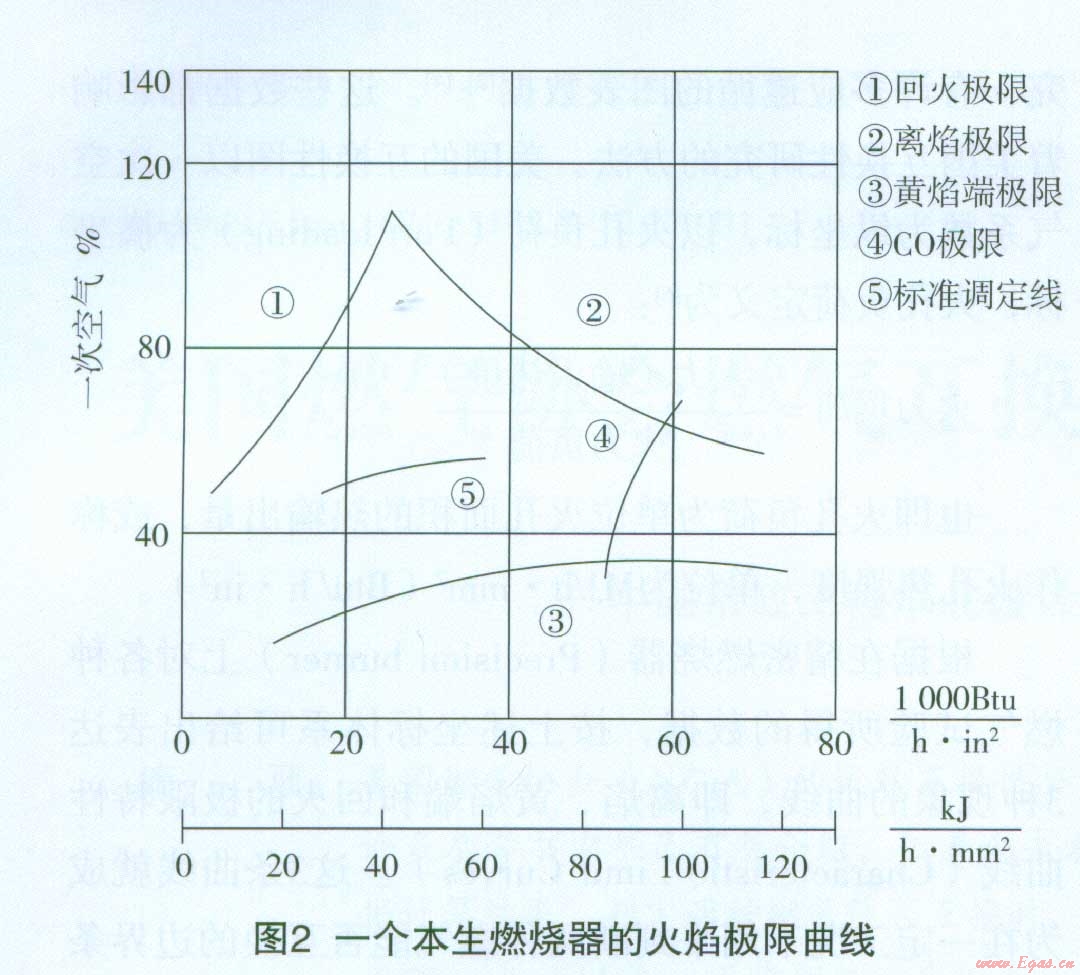 圖1中的中間范圍即燃具的設(shè)計范圍(DesighArea),也即滿意的運行范圍(SatisfactoryoperatingArea)。圖2中的⑤表示標(biāo)準(zhǔn)調(diào)定線。極限值相當(dāng)于金屬材料試驗中的屈服極限,滿意的運行范圍或標(biāo)準(zhǔn)