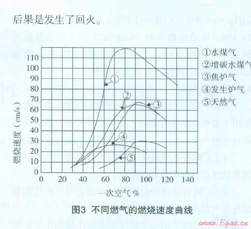 圖3所示為不同燃?xì)獾闹鹚俣扰c一次空氣百分?jǐn)?shù)的關(guān)系曲線,如與單一氣體的曲線相比可看出其火焰?zhèn)鞑ニ俣鹊淖畲笾迪喈?dāng)接近,但并不發(fā)生在相同的一次空氣百分?jǐn)?shù)值時。假設(shè)一個使用天然氣的燃燒器按一次空氣系數(shù)為65%調(diào)定(由圖3可知,曲線所示的著火速度約為9cm/s),然后改燒熱值為l400Btu/cf(52.16MJ/m3)的丁烷一空氣混合氣,則一次空氣百分?jǐn)?shù)很快上升到80%,火焰?zhèn)鞑ニ俣冗_(dá)到29cm/s[5],后果是發(fā)生了回火。