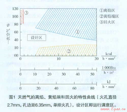 同樣,如用同一種燃?xì)庠谝粋€已定的燃燒器上對不同火孔負(fù)荷和已知燃燒器頭部溫度條件下進(jìn)行運行試驗,就可得到該燃?xì)馔暾碾x焰和黃焰端的極限特性曲線。同時也指明了發(fā)生離焰和黃焰端時相應(yīng)一次空氣百分?jǐn)?shù)的最大值和最小值。