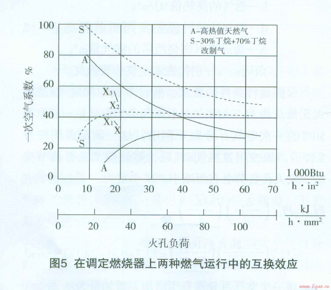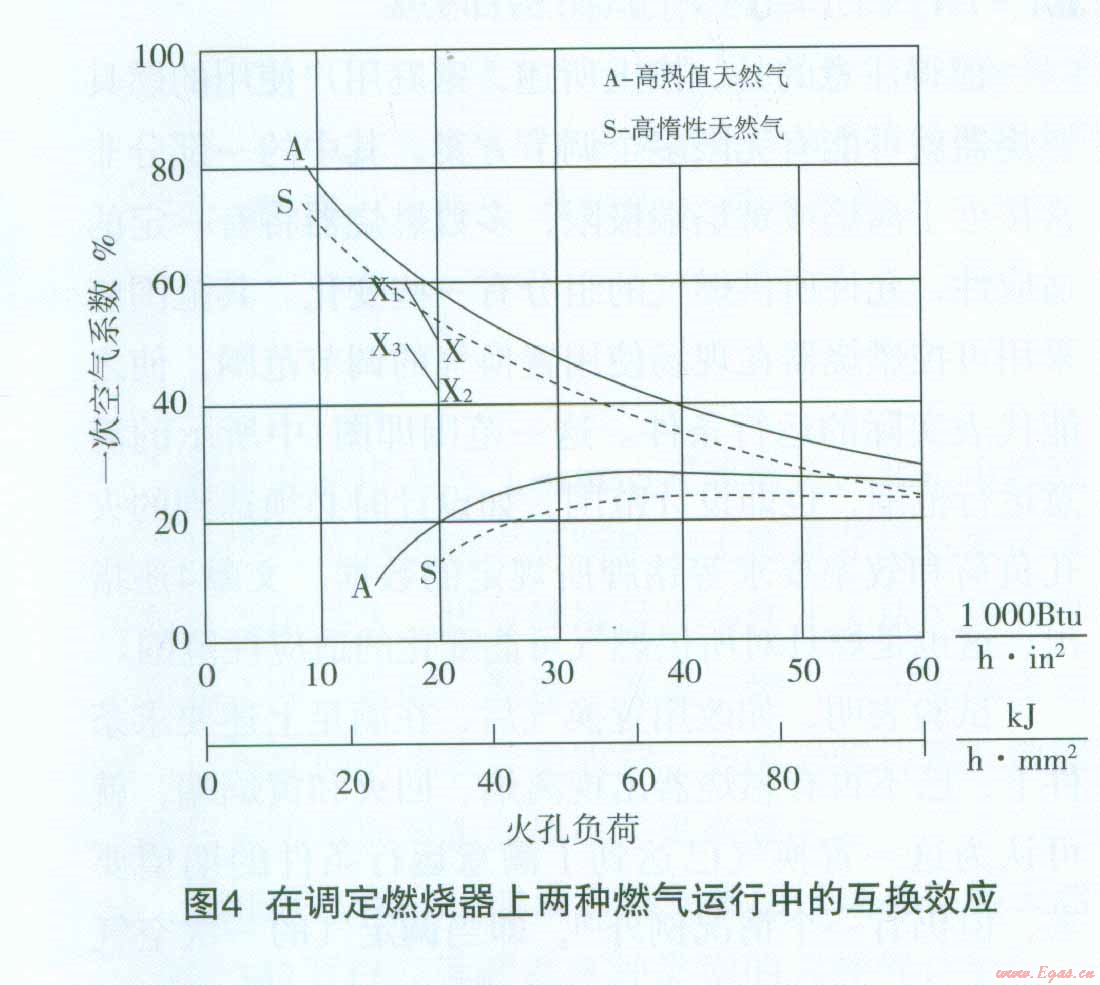 這說明用高熱值天然氣調(diào)定后的燃燒器在改用高惰性天然氣置換后,其運行工作點x。已高于高惰性天然氣的離焰極限曲線值(見圖4中X1的位置),會發(fā)生離焰。顯然,如調(diào)定點x置于調(diào)定氣的極限曲線上(一次空氣系數(shù)接近60%一見圖4),則置換后的工作點X1將遠(yuǎn)高于置換氣的離焰曲線(圖上未表示),這一運行工況是完全不能接受的。在這一特殊的假設(shè)條件下,如燃燒器的調(diào)定是在同樣的火孔負(fù)荷下,但一次空氣系數(shù)略低于50%(約為42%,其工作點在圖4上用X1表示,則在用高惰性天然氣置換后,一次空氣百分?jǐn)?shù)增加到PAx3=PAX2×1.1744=0.42×1.1744=0.4932即49.30%